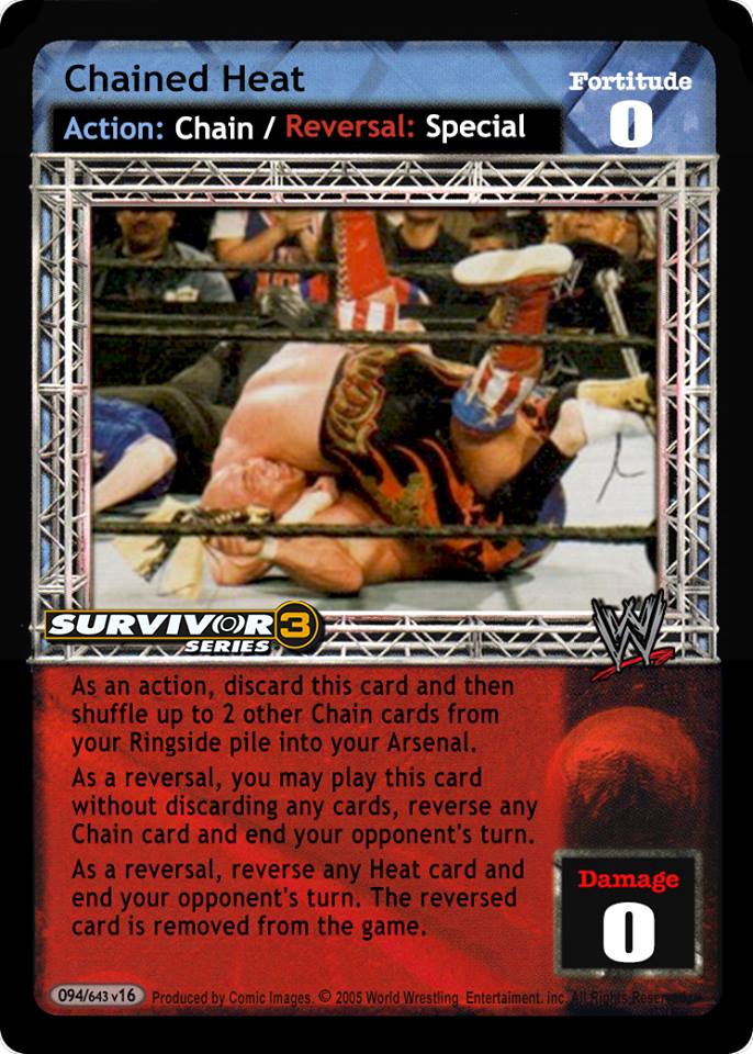 As an action, discard this card and then shuffle up to 2 other Chain cards from your Ringside pile into your Arsenal. As a reversal, reverse any Chain card or Heat card and end your opponent's turn. If the reversed card is a Chain card, you do not need to discard 2 cards in order to reverse it from your hand. If the reversed card is a Heat card, it is removed from the game.