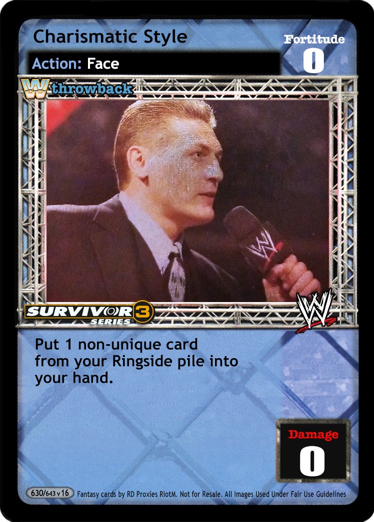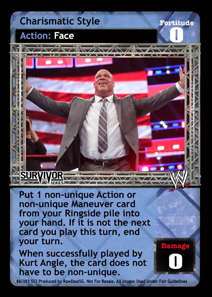 Put 1 non-unique Action or non-unique Maneuver card from your Ringside pile into your hand. If it is not the next card you play this turn, end your turn. When successfully played by Kurt Angle, the card does not have to be non-unique.