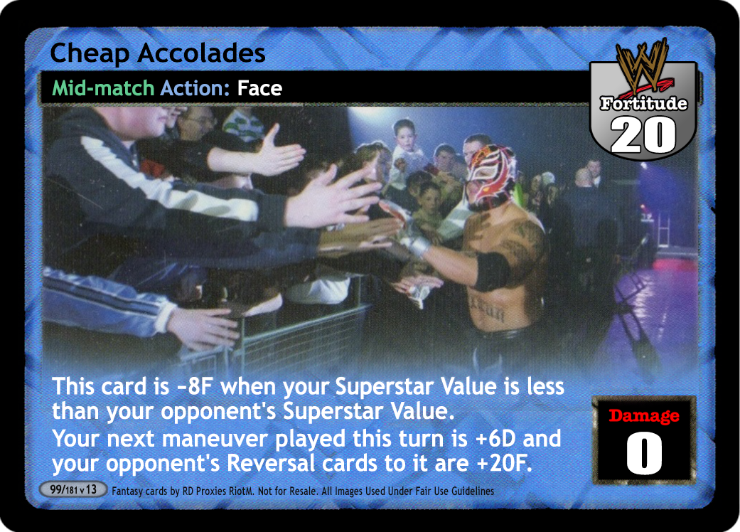 This card is -8F when your Superstar Value is less than your opponent's Superstar Value. Your next maneuver played this turn is +6D and your opponent's Reversal cards to it are +20F.