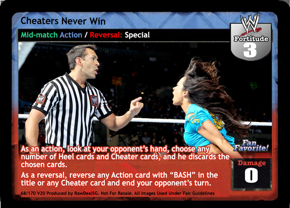 As an action, look at your opponent's hand, choose any number of Heel cards and Cheater cards, and he discards the chosen cards. As a reversal, reverse any Action card with "BASH" in the title or any Cheater card and end your opponent's turn.