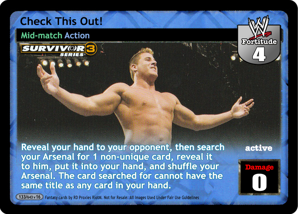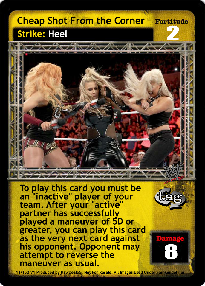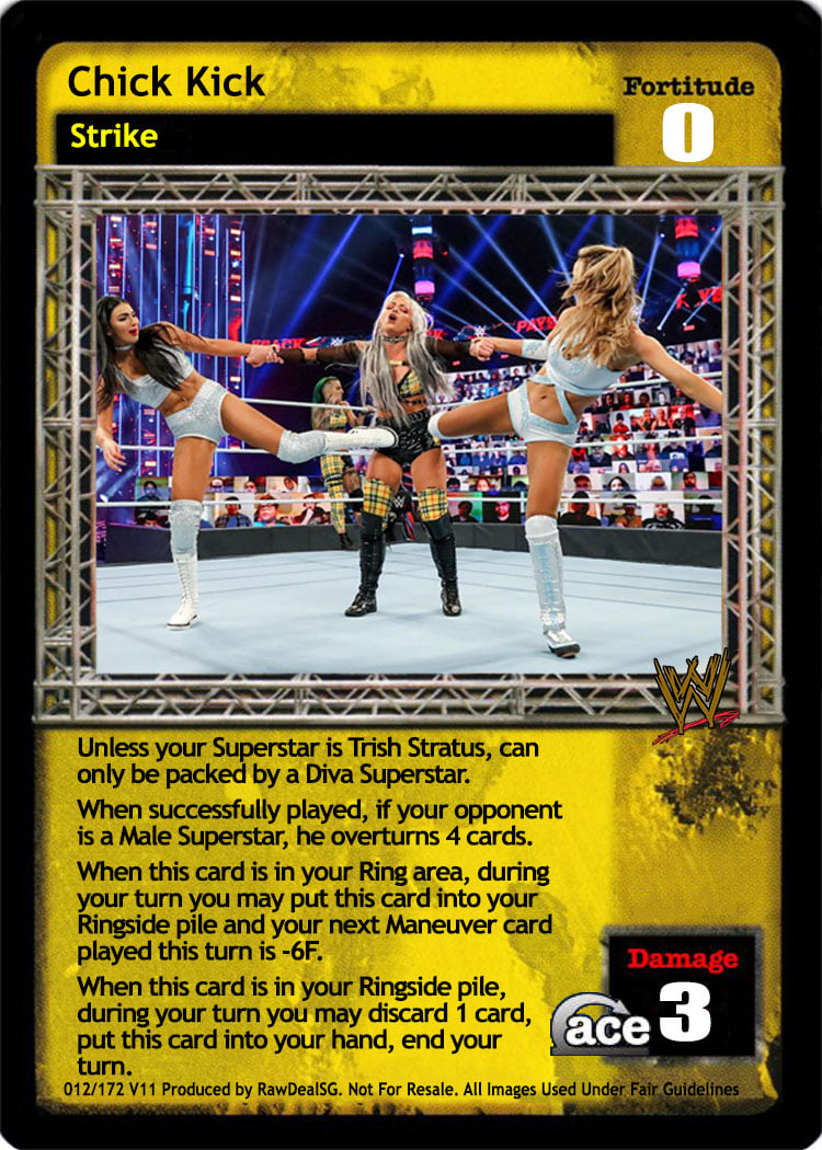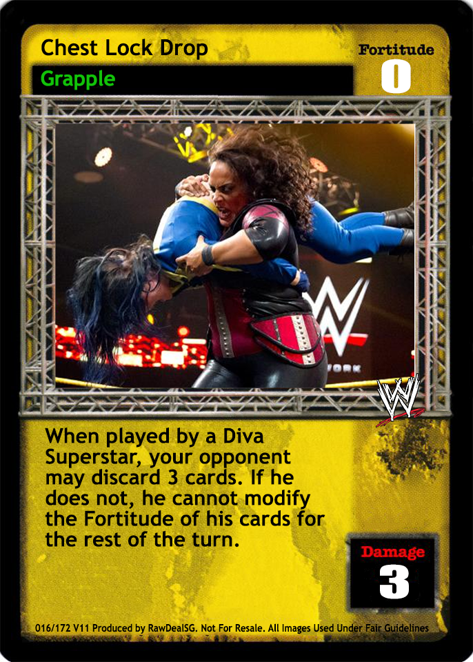 When played by a Diva Superstar, your opponent may discard 3 cards. If he does not, he cannot modify the Fortitude of his cards for the rest of the turn.