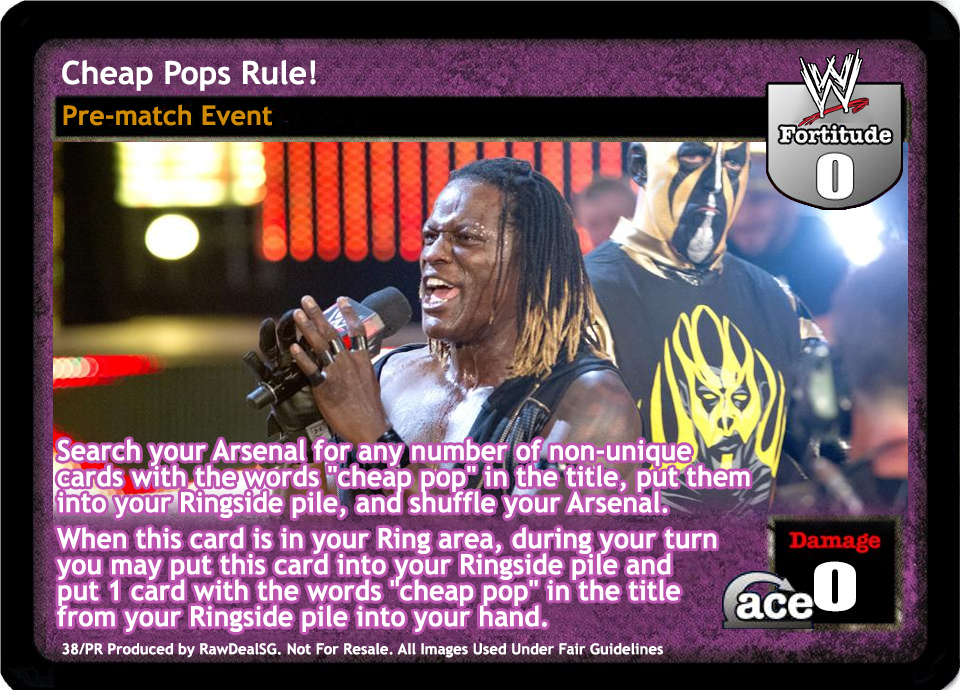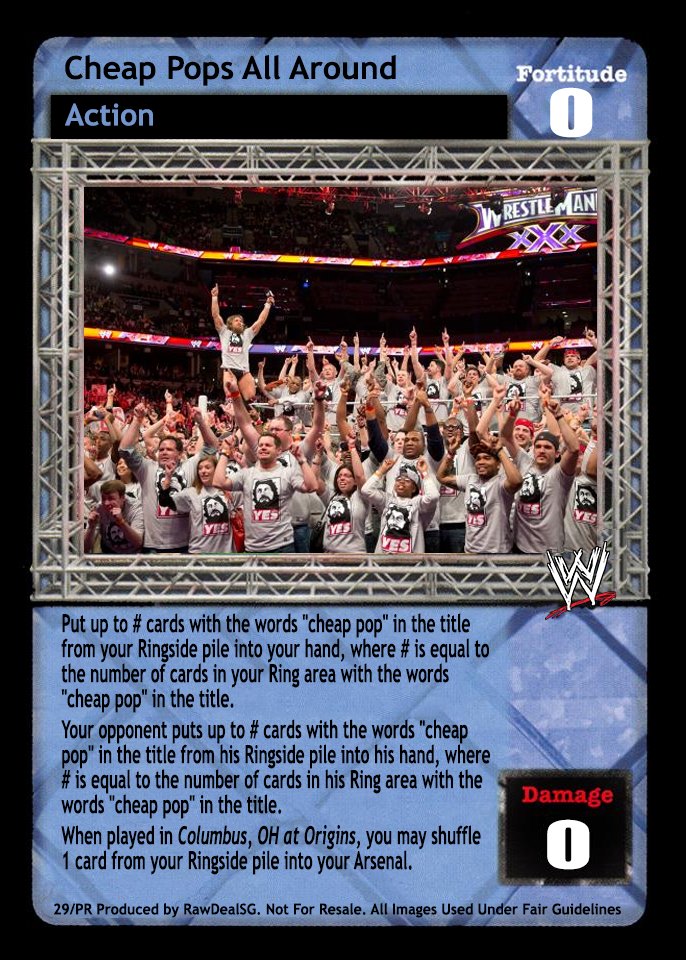 Put up to # cards with the words "cheap pop" in the title from your Ringside pile into your hand, where # is equal to the number of cards in your Ring area with the words "cheap pop" in the title. Your opponent puts up to # cards with the words "cheap pop" in the title from his Ringside pile into his hand, where # is equal to the number of cards in his Ring area with the words "cheap pop" in the title. When played in Columbia, OH at Origins, you may shuffle 1 card from your Ringside pile into your Arsenal.