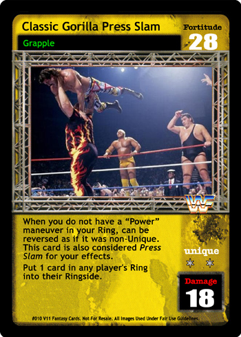 When you do not have a 'Power' maneuver in your Ring, can be reversed as if it was non-Unique. This card is also considered Press Slam for your effects. Put 1 card in any player's Ring into their Ringside.