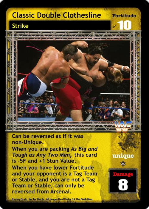 Can be reversed as if it was non-Unique. When you are packing As Big and Tough as Any Two Men, this card is -5F and +1 Stun Value. When you have lower Fortitude and your opponent is a Tag Team or Stable, and you are not a Tag Team or Stable, can only be reversed from Arsenal.