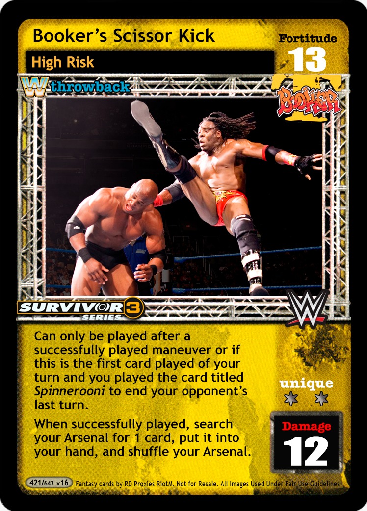 When this card is in your ring area, you opponent randomly discards for your superstar ability. During your turn, you may put this card into your ringside pile, then put 2 mid-match cards from your ringside pile into your backlash deck. During your opponent`s turn, he may randomly discard 3 cards from his backlash deck and then remove this card form the game.
