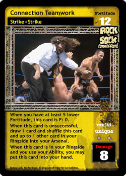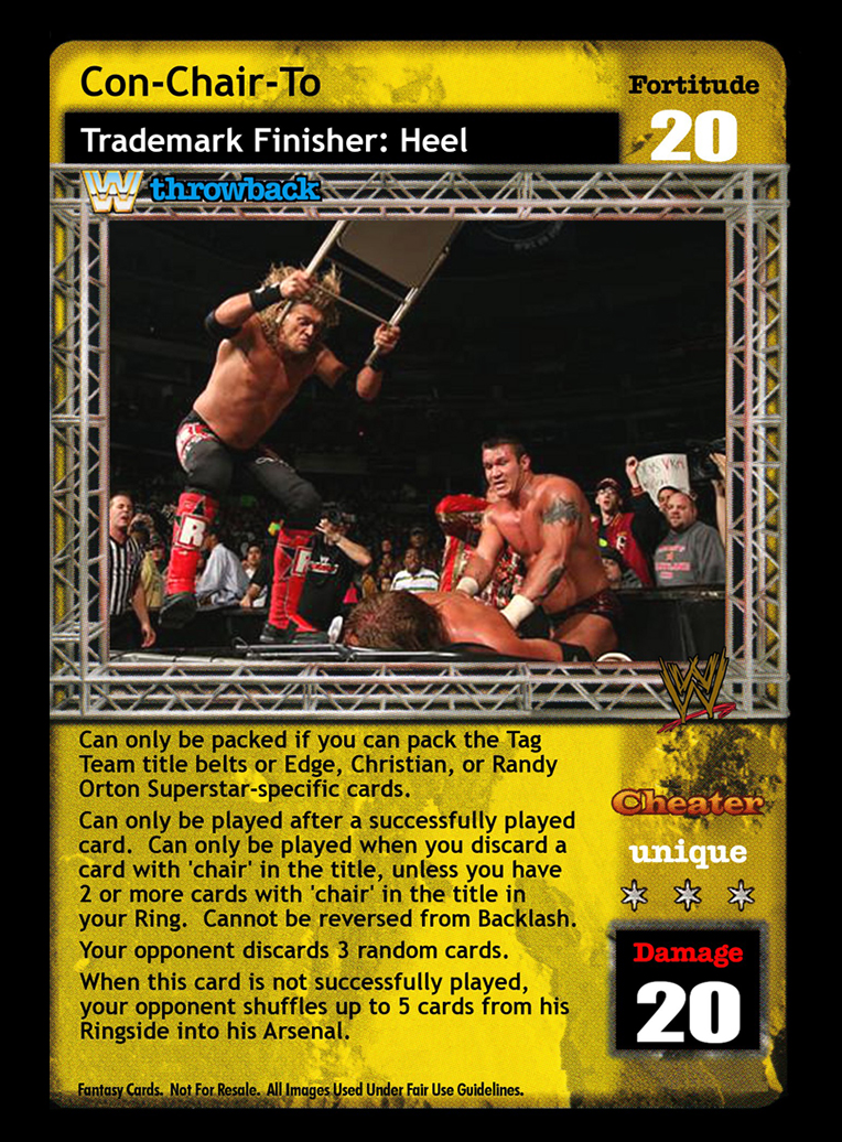 Can only be packed if you can pack the Tag Team title belts or Edge, Christian, or Randy Orton Superstar-specific cards. Can only be played after a successfully played card. Can only be played when you discard a card with 'chair' in the title, unless you have 2 or more cards with 'chair' in the title in your Ring. Cannot be reversed from Backlash. Your opponent discards 3 random cards. When this card is not successfully played, your opponent shuffles up to 5 cards from his Ringside into his Arsenal.