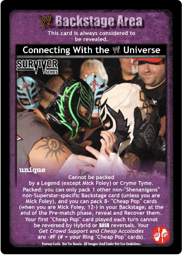 This card is always considered to be revealed. Cannot be packed by a Legend (except Mick Foley) or Cryme Tyme. When packing this card and you are not Mick Foley, you may only pack 1 other non-Superstar-specific Backstage card, and you may pack up to 8 cards with 'cheap pop' in the title (up to 12 when you are Mick Foley) in your Backstage Area; at the end of the Pre-match phase, reveal those cards and shuffle them into your Arsenal. Your first card played each turn with 'cheap pop' in the title cannot be reversed by hybrid or BASH reversals, and your Get Crowd Support and Cheap Accolades cards are -1F for every card in your Ring with 'cheap pop' in the title.