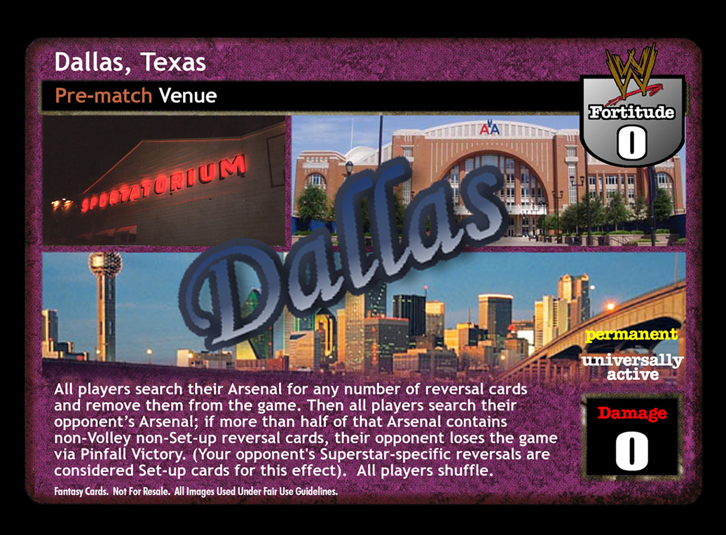All players search their Arsenal for any number of reversal cards and remove them from the game. Then all players search their opponents Arsenal; if more than half of that Arsenal contains non-Volley non-Set-up reversal cards, their opponent loses the game via Pinfall Victory. (Your opponent's Superstar-specific reversals are considered Set-up cards for this effect). All players shuffle.