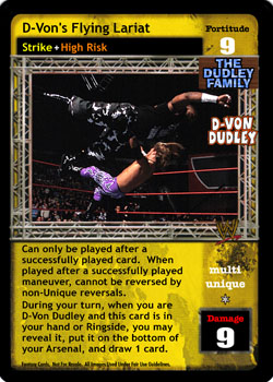 Can only be played after a successfully played card. When played after a successfully played maneuver, cannot be reversed by non-Unique reversals. During your turn, when you are D-Von Dudley and this card is in your hand or Ringside, you may reveal it, put it on the bottom of your Arsenal, and draw 1 card.