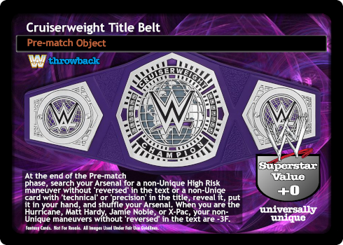 At the end of the Pre-match phase, search your Arsenal for a non-Unique High Risk maneuver without 'reversed' in the text or a non-Unique card with 'technical' or µprecision' in the title, reveal it, put it in your hand, and shuffle your Arsenal. ßWhen you are the Hurricane, Matt Hardy, Jamie Noble, or X-Pac, your non-unique maneuvers without 'reversed' in the text are -3F. Superstar Value +1