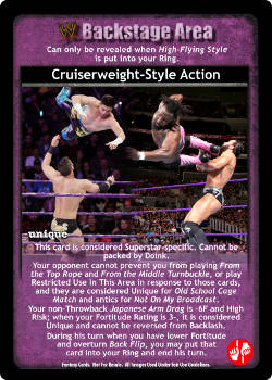 *Can only be revealed when High-Flying Style is put into your Ring. This card is considered Superstar-specific. Cannot be packed by Doink. Your opponent cannot prevent you from playing From the Top Rope and From the Middle Turnbuckle, or play Restricted Use In This Area in response to those cards, and they are considered Unique for Old School Cage Match and antics for Not On My Broadcast. Your non-Throwback Japanese Arm Drag is -6F and High Risk; when you Fortitude Rating is 3-, it is considered Unique and cannot be reversed from Backlash. During his turn when you have lower Fortitude and overturn Back Flip, you may put that card into your Ring and end his turn.