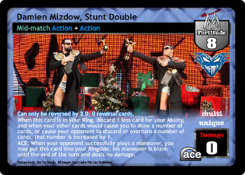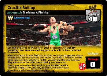 Can only be played as a Counter or after a successfully played 8D+ maneuver. Your opponent must overturn cards until he has overturned 3 reversals. When this card is in your Backlash and your non-Legend opponent uses a printed non-Superstar-specific card effect to prevent a Pinfall or shuffle cards into their Arsenal after a Pinfall, you may put this card into your Ring and then reverse that effect (even during your own turn). During your turn when this card is in your Backlash and his Fortitude Rating is 10+, you may discard it and draw 1 card.