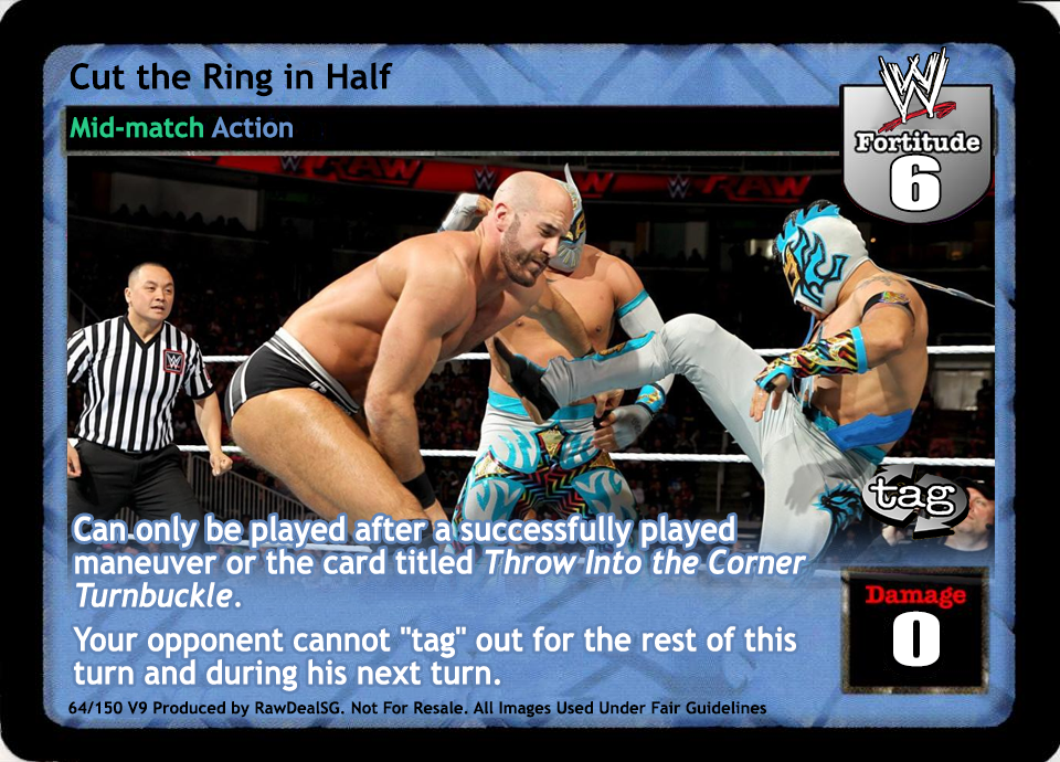 Can only be played after a successfully played maneuver or the card titled Throw Into the Corner Turnbuckle. Your opponent cannot "tag" out for the rest of this turn and during his next turn.