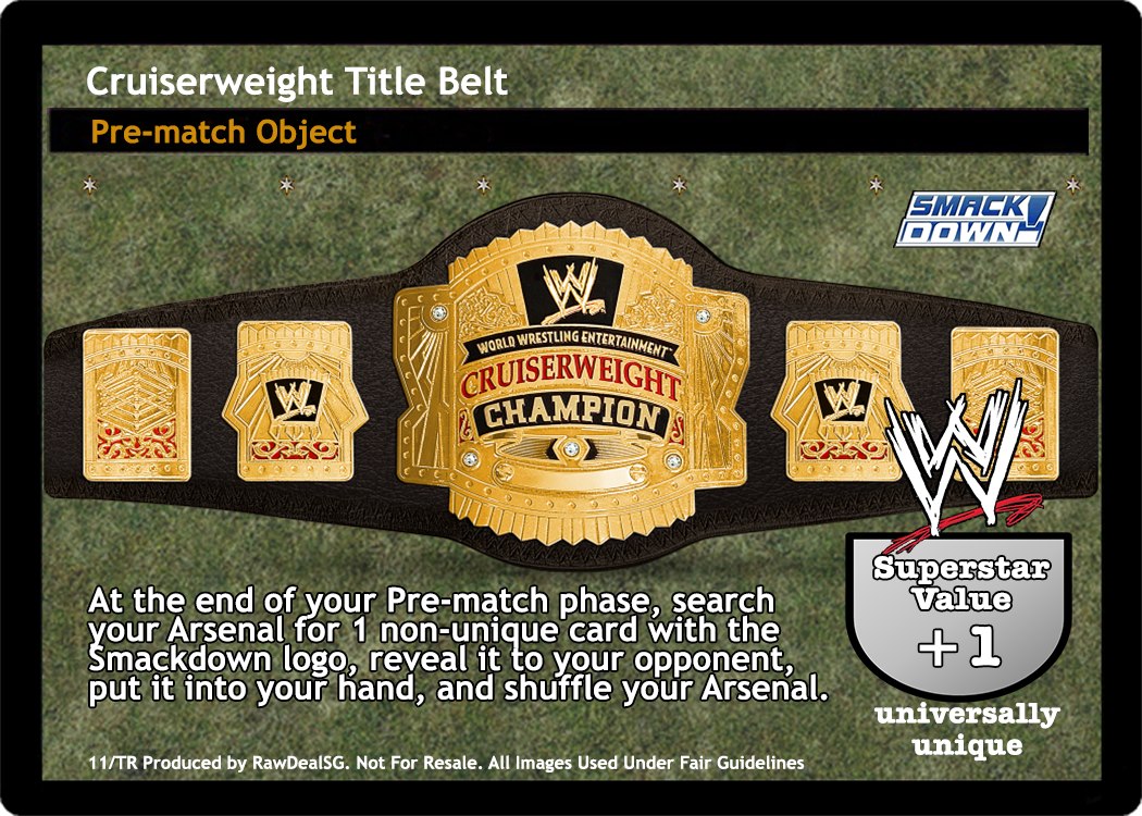 At the end of the Pre-match phase, search your Arsenal for 1 non-unique card with the Smackdown logo, reveal it to your opponent, put it into your hand, and shuffle your Arsenal. Your Superstar Value is +1