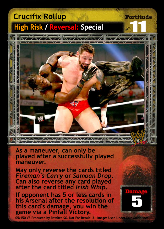As a maneuver, can only be played after a successfully played maneuver. May only reverse the cards titled Fireman's Carry or Samoan Drop. Can also reverse any card played after the card titled Irish Whip. If opponent has 5 or less cards in his Arsenal after the resolution of this card's damage, you win the game via a Pinfall Victory.