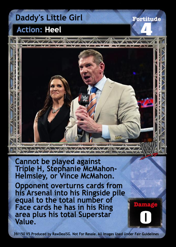 Cannot be played against Triple H, Stephanie McMahon-Helmsley, or Vince McMahon. Opponent overturns cards from his Arsenal into his Ringside pile equal to the total number of Face cards he has in his Ring area plus his total Superstar Value.