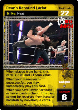 When played from hand, this card is -10F and +1 Stun Value. When your maneuver is unsuccessful, you may immediately play this card. When you have lower Fortitude or fewer cards in hand, this card cannot be reversed from hand or Backlash by non-Unique cards.