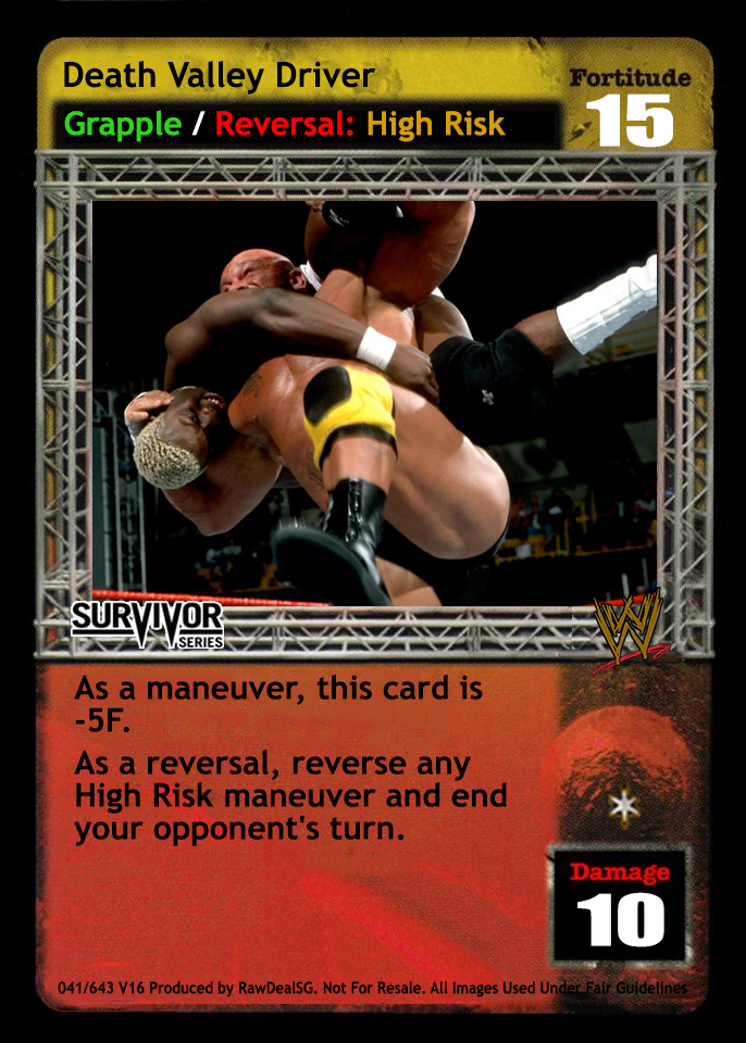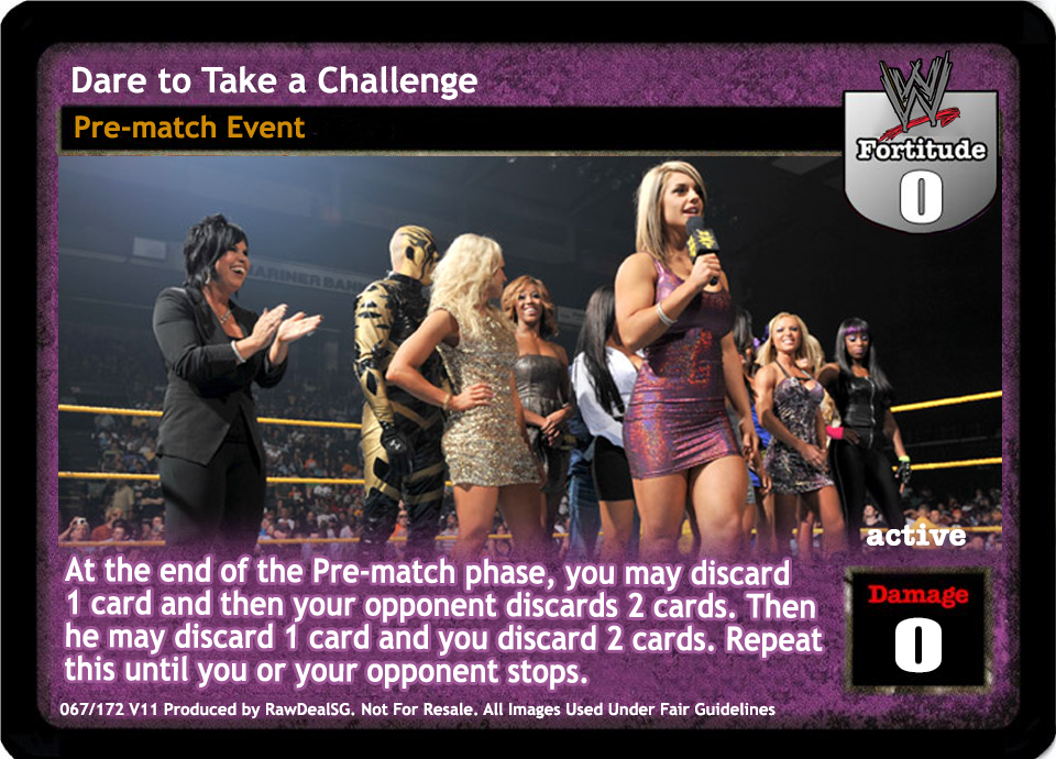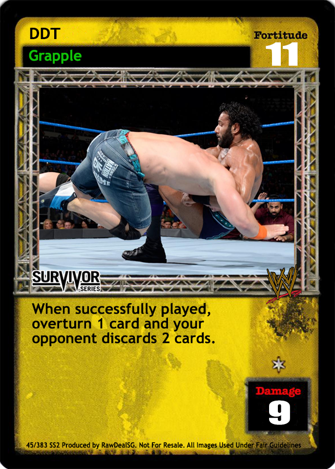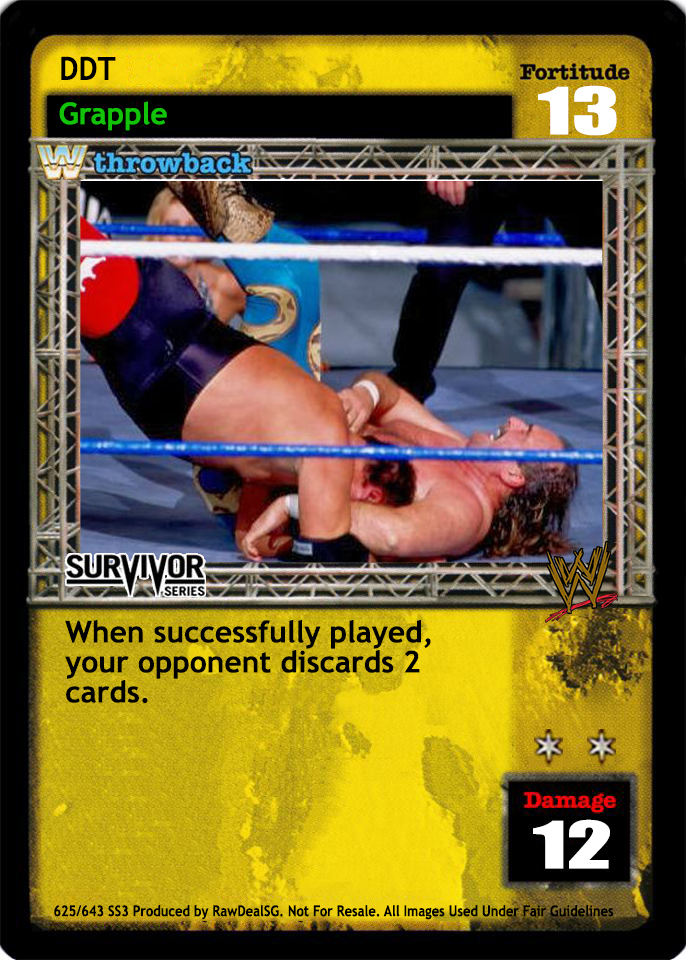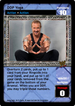 Overturn 2 cards, put up to 1 card from your Ringside into your hand, and put up to 1 of your cards removed from the game on the bottom of your Arsenal. When you are DDP, you may triple those numbers.