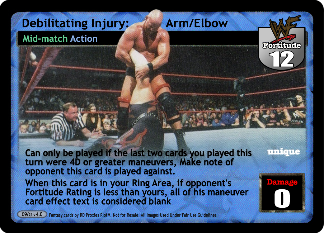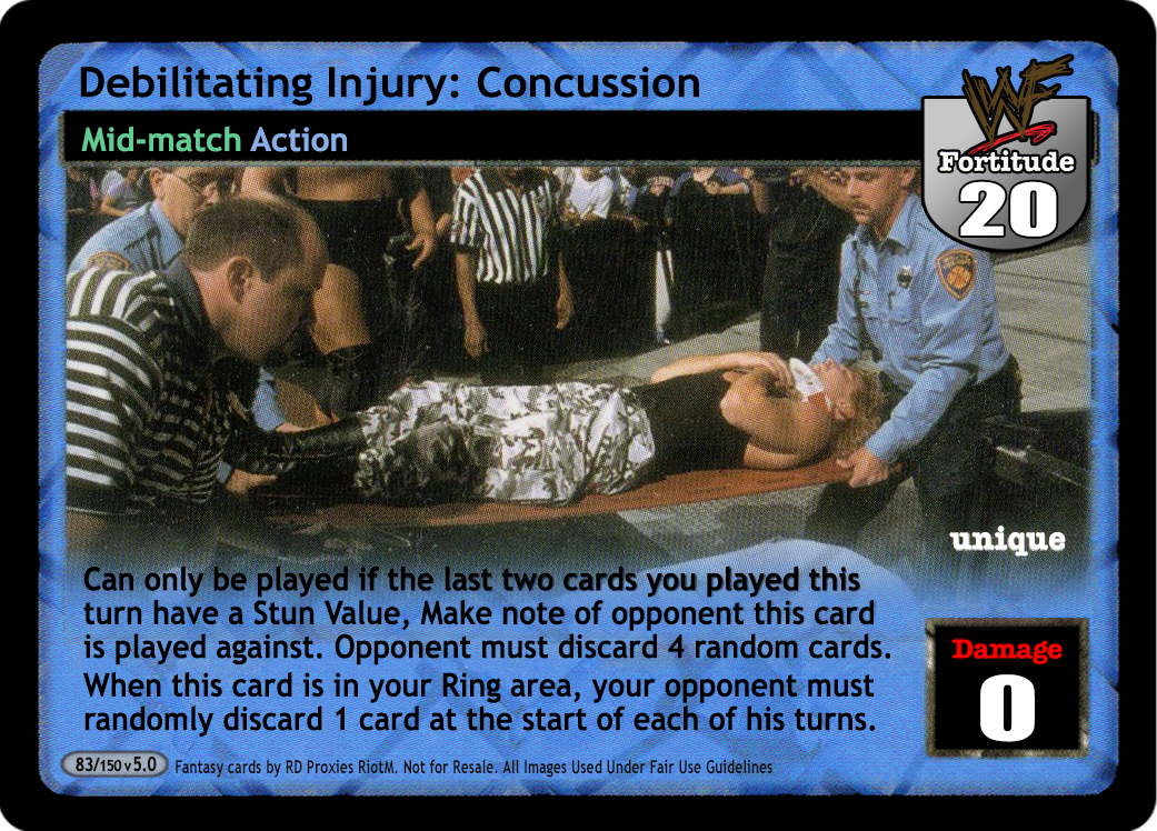 Can only be played if the last two cards you played this turn have a Stun Value, make note of opponent this card is played against. Opponent must discard 4 random cards. When this card is in your Ring area, your opponent must randomly discard 1 card at the start of each of his turns.