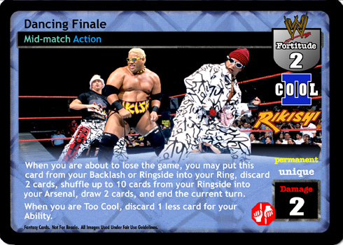 When you are about to lose the game, you may put this card from your Backlash or Ringside into your Ring, discard 2 cards, shuffle up to 10 cards from your Ringside into your Arsenal, draw 2 cards, and end the current turn. When you are Too Cool, discard 1 less card for your Ability.