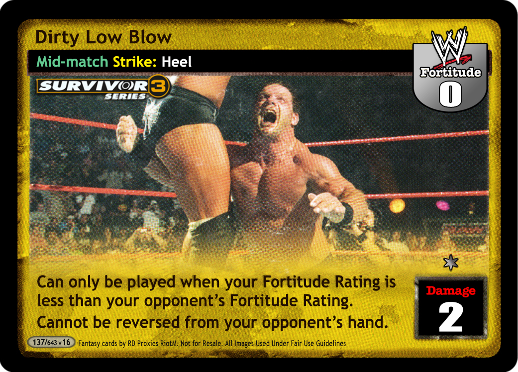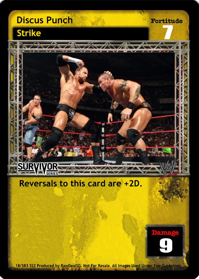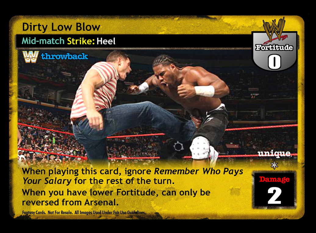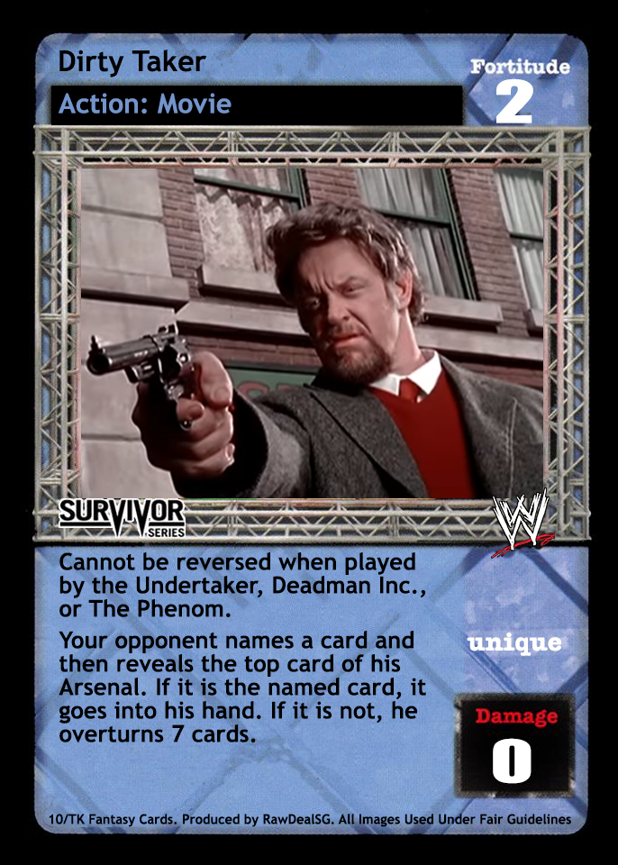 Cannot be reversed when played by the Undertaker, Deadman Inc., or The Phenom. Your opponent names a card and then reveals the top card of his Arsenal. If it is the named card, it goes into his hand. If it is not, he overturns 7 cards.