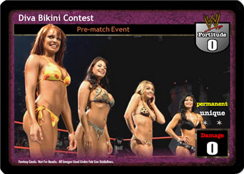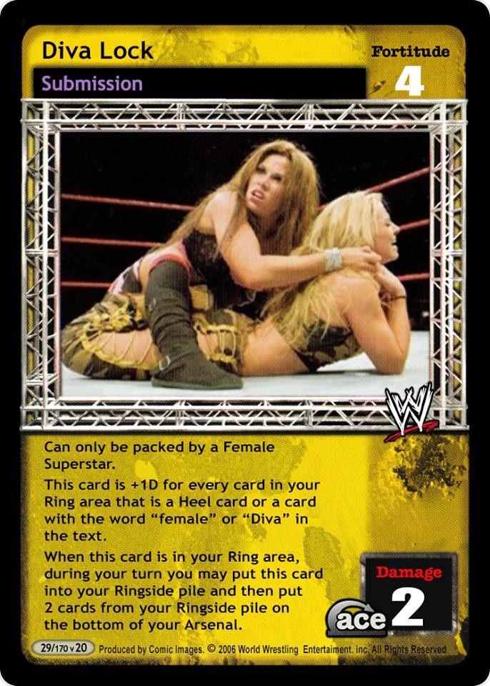 Can only be packed by a Female Superstar. This card is +1D for every card in your Ring area that is a Heel card or a card with the word "female" or "Diva" in the text. When this card is in your Ring area, during your turn you may put this card into your Ringside pile and then put 2 cards from your Ringside pile on the bottom of your Arsenal.