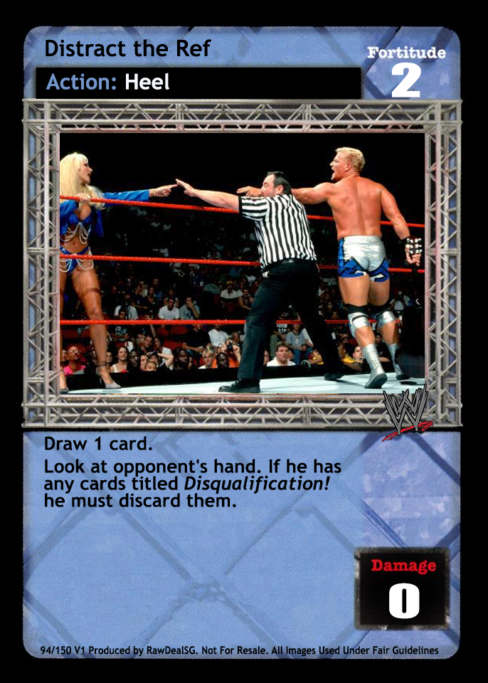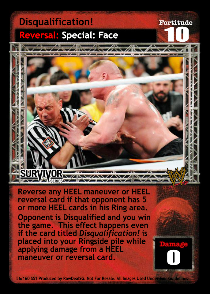 Reverse any HEEL maneuver or reversal card if that opponent has 5 or more HEEL cards in his Ring area. Opponent is Disqualified and you win the game. This effect happens even if the card titled Disqualification is placed into your Ringside pile while applying damage from a HEEL maneuver or reversal card.
