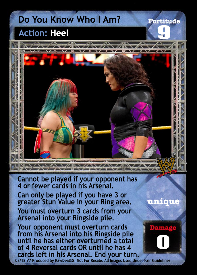 Cannot be played if your opponent has 4 or fewer cards in his Arsenal. Can only be played if you have 3 or greater Stun Value in your Ring area. You must overturn 3 cards from your Arsenal into your Ringside pile. Your opponent must overturn cards from his Arsenal into his Ringside pile until he has either overturned a total of 4 Reversal cards OR until he has 4 cards left in his Arsenal. End your turn.