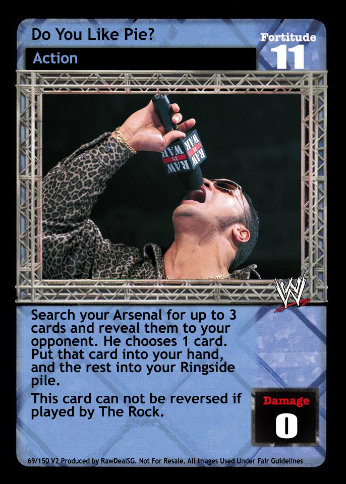 Search your Arsenal for up to 3 cards and reveal them to your opponent. He chooses 1 card. Put that card into your hand, and the rest into your Ringside pile. This card can not be reversed if played by The Rock.