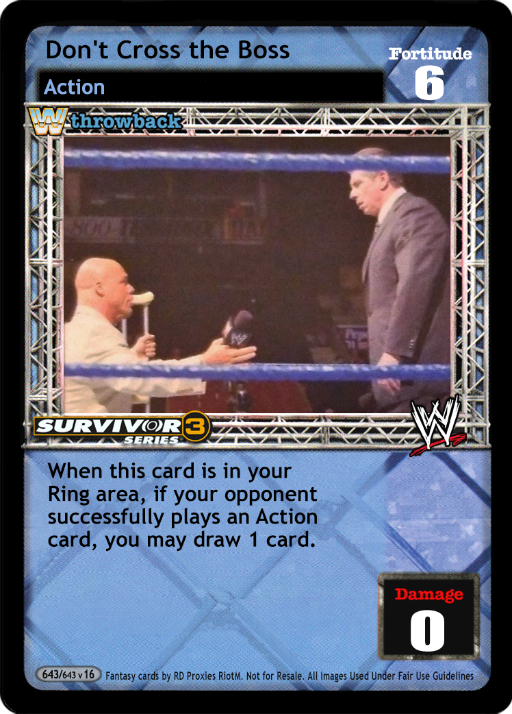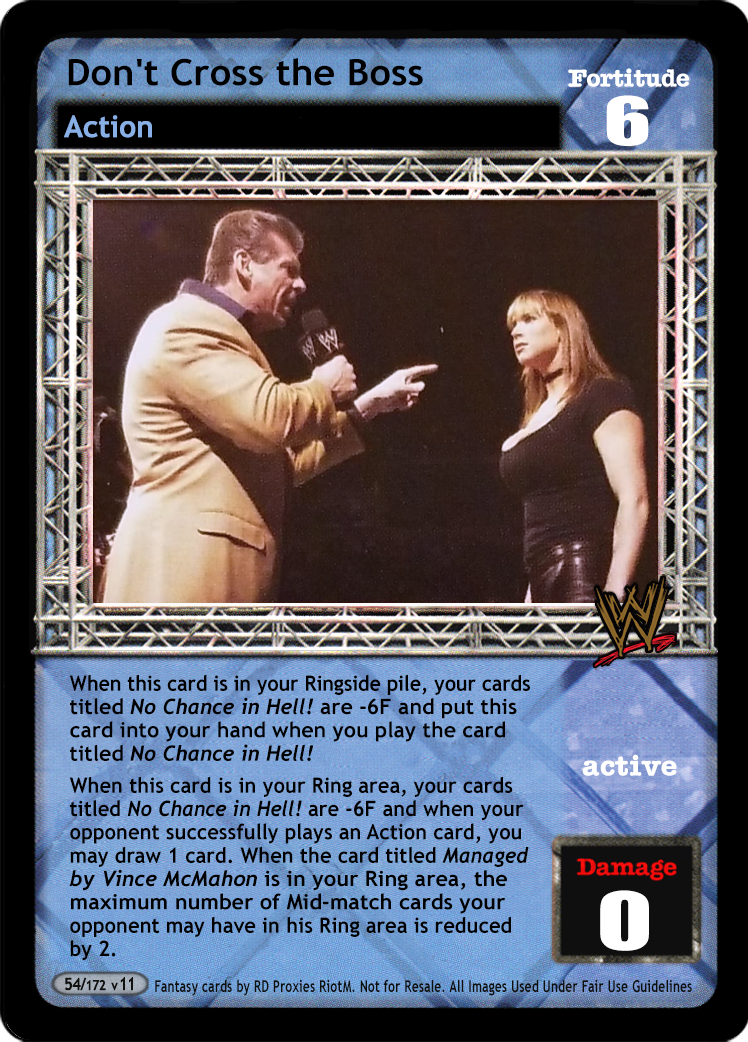 When this card is in your Ringside pile, your cards titled No Chance in Hell! are -6F and put this card into your hand when you play the card titled No Chance in Hell! When this card is in your Ring area, your cards titled No Chance in Hell! are -6F and when your opponent successfully plays an Action card, you may draw 1 card. When the card titled Managed by Vince McMahon is in your Ring area, the maximum number of Mid-match cards your opponent may have in his Ring area is reduced by 2.