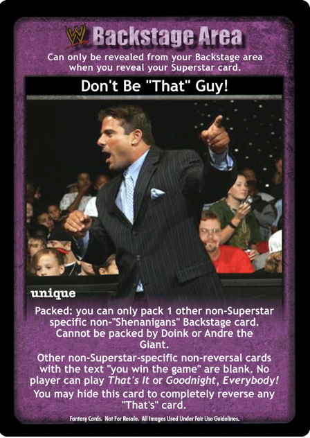 When packing this card, you can only pack 1 other non-Superstar-specific Backstage card that does not have 'shenanigans' in the title. Cannot be packed by Doink or Andre the Giant. Non-Superstar Specific non-reversal cards with the text 'you win the game' have blank text. No player can play That's It or Goodnight, Everybody! You may hide this card to completely reverse any card with 'That's' in the title.