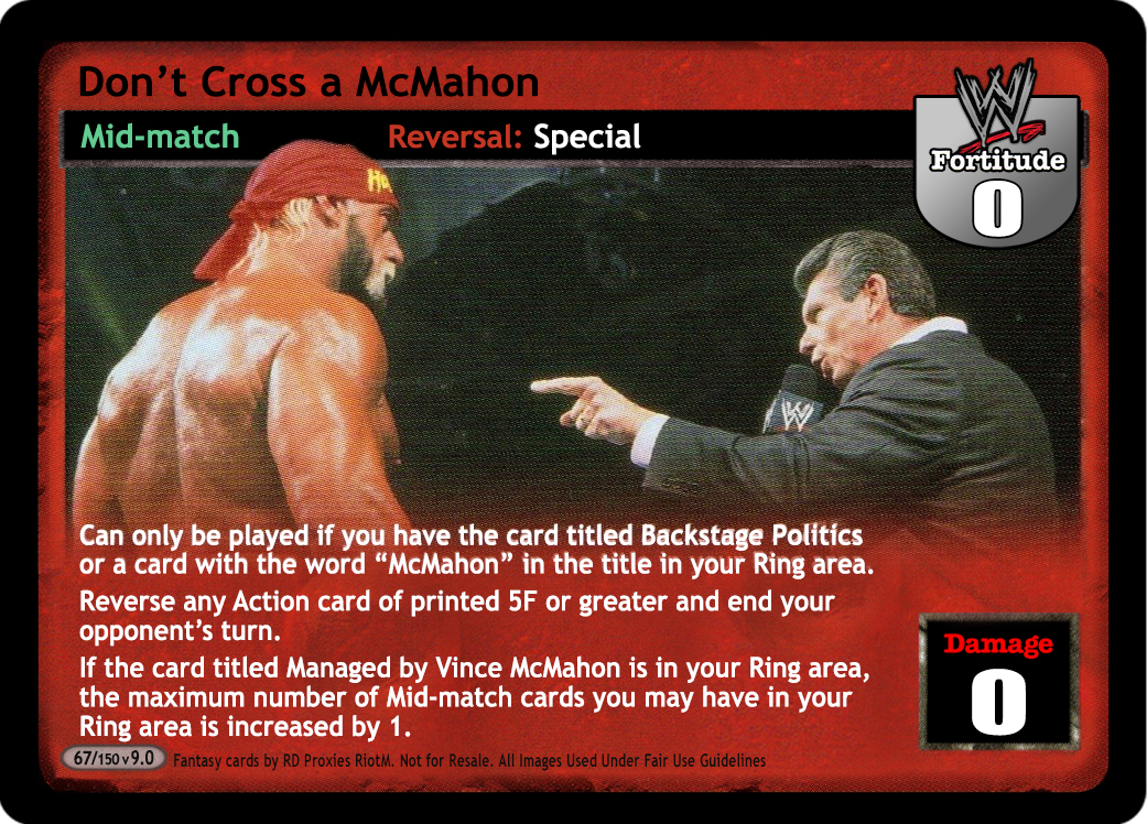 Can only be played if you have the card titled Backstage Politics or a card with the word "McMahon" in the title in your Ring area. Reverse any Action card of printed 5F or greater and end your opponent's turn. If the card titled Managed by Vince McMahon is in your Ring area, the maximum number of Mid-match cards you may have in your Ring area is increased by 1.