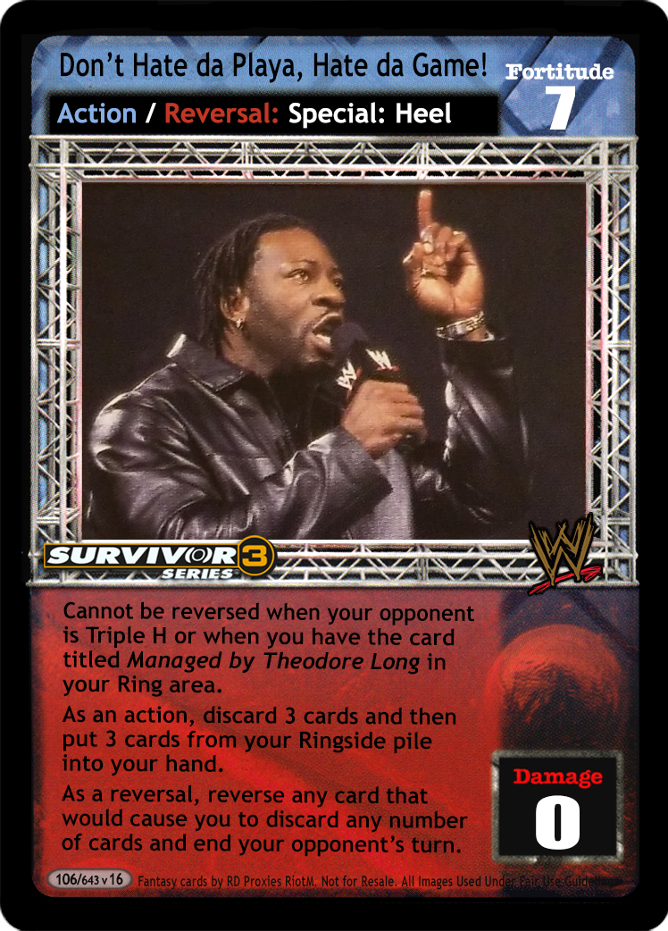 Cannot be reversed when your opponent is Triple H or when you have the card titled Managed by Theodore Long in your Ring area. As an action, discard 3 cards and then put 3 cards from your Ringside pile into your hand. As a reversal, reverse any card that would cause you to discard any number of cards and end your opponent's turn.