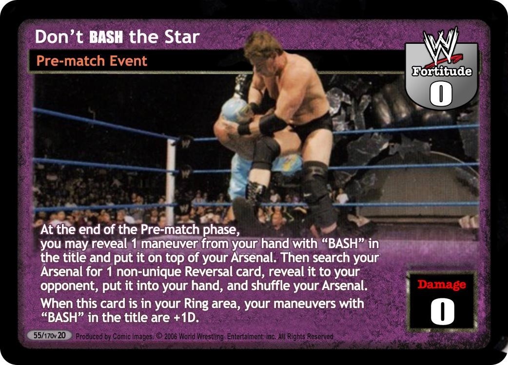 At the end of the Pre-match phase, you may reveal 1 maneuver from your hand with "BASH" in the title and put it on top of your Arsenal. Then search your Arsenal for 1 non-unique Reversal card, reveal it to your opponent, put it into your hand, and shuffle your Arsenal. When this card is in your Ring area, your maneuvers with "BASH" in the title are +1D.