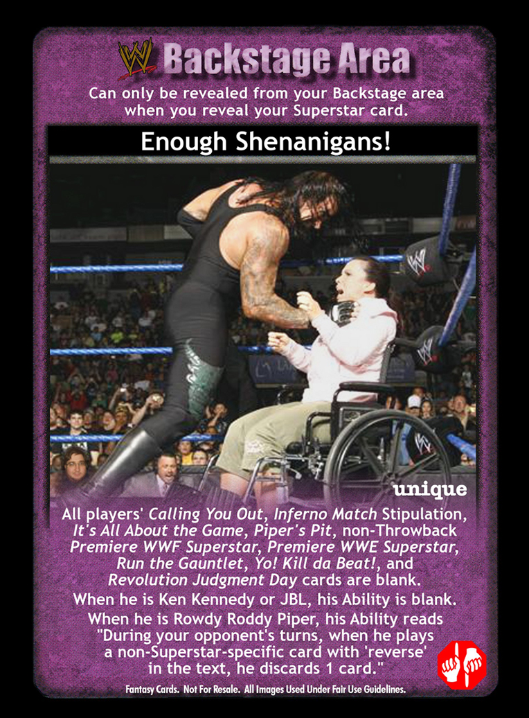 All players' Calling You Out, Inferno Match Stipulation, It's All About the Game, Piper's Pit, non-Throwback Premiere WWF Superstar, Premiere WWE Superstar, Run the Gauntlet, Yo! Kill da Beat!, Revolution Judgment Day cards are blank. When he is Ken Kennedy or JBL, his Ability is blank. When he is Rowdy Roddy Piper, his Ability reads 'During your opponent's turns, when he plays a non-Superstar-specific card with 'reverse' in the text, he discards 1 card.'