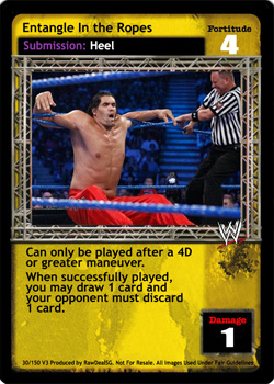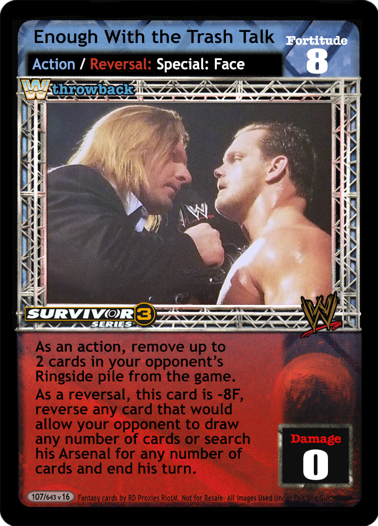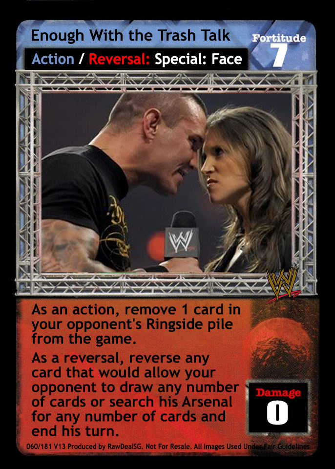 As an action, remove 1 card in your opponent's Ringside pile from the game. As a reversal, reverse any card that would allow your opponent to draw any number of cards or search his Arsenal for any number of cards and end his turn.