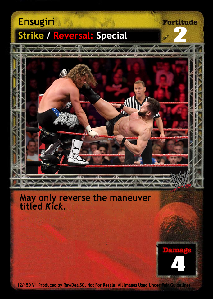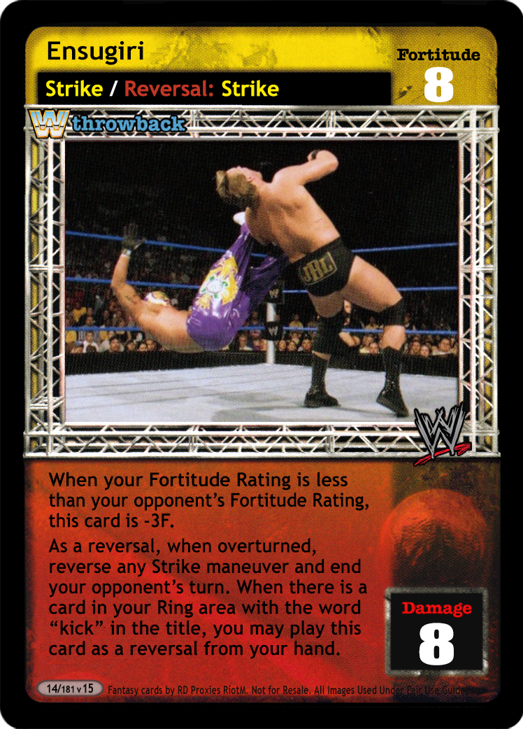 When your Fortitude Rating is less than your opponent's Fortitude Rating, this card is -3F. As a reversal, when overturned, reverse any Strike maneuver and end your opponent's turn. When there is a card in your Ring area with the word "kick" in the title, you may play this card as a reversal from your hand.