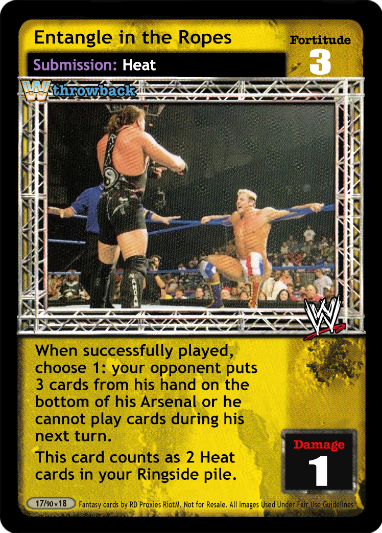 When successfully played, choose 1: your opponent puts 3 cards from his hand on the bottom of his Arsenal or he cannot play cards during his next turn. This card counts as 2 Heat cards in your Ringside pile.