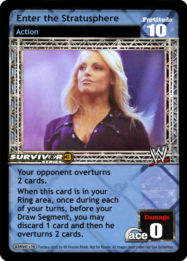 Cannot be played if your opponent is Trish Stratus. Your opponent overturns 2 cards. When this card is in your Ring area, once during each of your turns, you may discard 1 card before your Draw Segment and then your opponent overturns 2 cards.