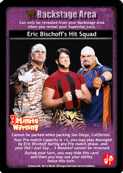 Cannot be packed when packing San Diego, California. Your Pre-match Capacity is +3, you may play Managed by Eric Bischoff during any Pre-match phase, and your Did I Just Say... 3 Minutes? cannot be reversed. During your turn, you may hide this card and then you may use your Ability twice this turn.