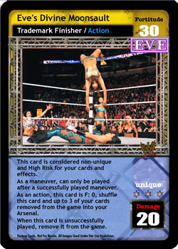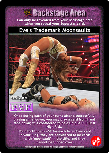 Once during each of your turns after successfully playing a maneuver, you may play 1 card from hand face down; it is considered to be a Unique F: 0 D: 8 High Risk. Your Fortitude is +5F for each face-down card in your Ring, they are considered to be cards with 'moonsault' in the title, and they cannot be flipped over.