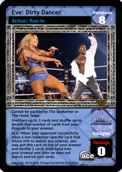 Cannot be packed by The Godfather or The Home Team. Overturn up to 3 cards and shuffle up to double that number of cards from your Ringside to your Arsenal. ACE: When your opponent successfully plays a non-Superstar-Specific card that allows him to search any Arsenal, you may put this card on top of your Arsenal and shuffle 2 cards from hand into your Arsenal and then he does not search and his turn ends.