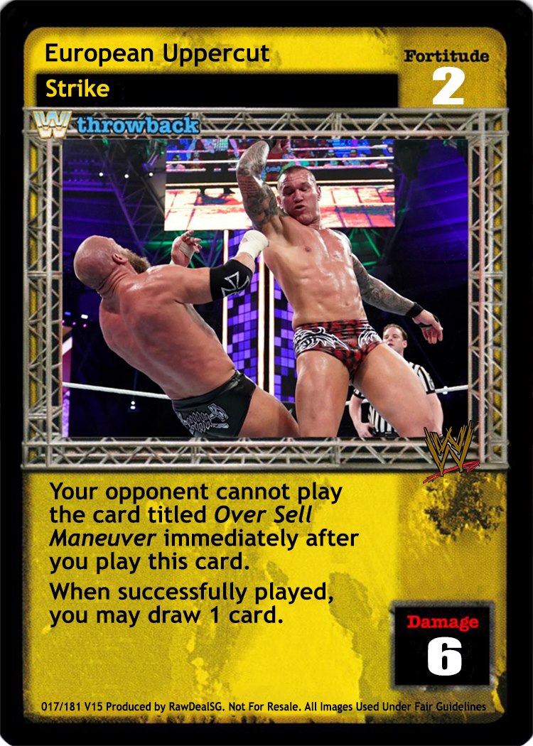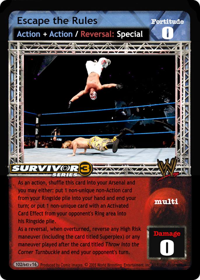 As an action, shuffle this card into your Arsenal and you may either: put 1 non-unique non-Action card from your Ringside pile into your hand and end your turn; or put 1 non-unique card with an Activated Card Effect from your opponent's Ring area into his Ringside pile. As a reversal, when overturned, reverse any High Risk maneuver (including the card titled Superplex) or any maneuver played after the card titled Throw Into the Corner Turnbuckle and end your opponent's turn.