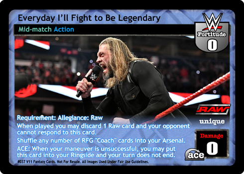 Requirement: Allegiance: Raw When played you may discard 1 Raw card and your opponent cannot respond to this card. Shuffle any number of RFG 'Coach' cards into your Arsenal. ACE: When your maneuver is unsuccessful, you may put this card into your Ringside and your turn does not end.