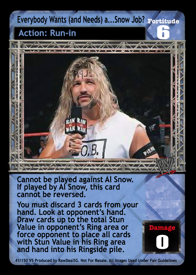 Cannot be played against Al Snow. If played by Al Snow, this card cannot be reversed. You must discard 3 cards from your hand. Look at opponent's hand. Draw cards up to the total Stun Value in opponent's Ring area or force opponent to place all cards with Stun Value in his Ring area and hand into his Ringside pile.