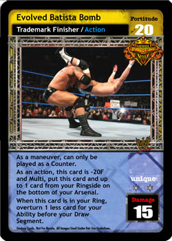 As a maneuver, can only be played as a Counter. As an action, this card is -20F and Multi, put this card and up to 1 card from your Ringside on the bottom of your Arsenal. When this card is in your Ring, overturn 1 less card for your Ability before your Draw Segment.