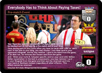 Your Superstar-specific non-Faction Pre-match cards cannot be blanked and do not take up a Pre-match slot in your Ring. Once during each of your turns, when you have no cards with 'nWo' or 'don't care' in the title in your Ring, you may choose 1 non-Heat card in your opponent's Ringside, and he may remove 1 card in his hand from the game; if he does not, he removes the chosen card from the game. ACE: When your Irwin R. Schyster-specific card or your card with 'Million Dollar Corporation' in the text is unsuccessful, you may remove 1 card in your Ringside from the game and then put the reversed card into your hand or Backlash instead (regardless of other effects). This effect cannot be reversed.