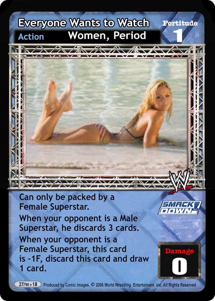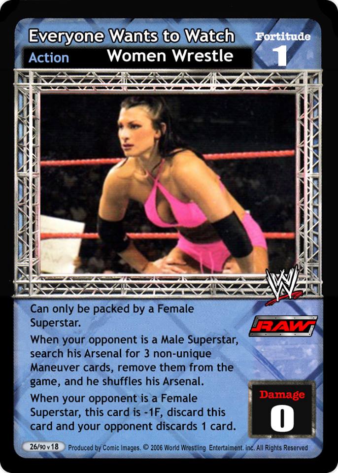 Can only be packed by a Female Superstar. When your opponent is a Male Superstar, he discards 3 cards. When your opponent is a Female Superstar, this card is -1F, discard this card and draw 1 card.