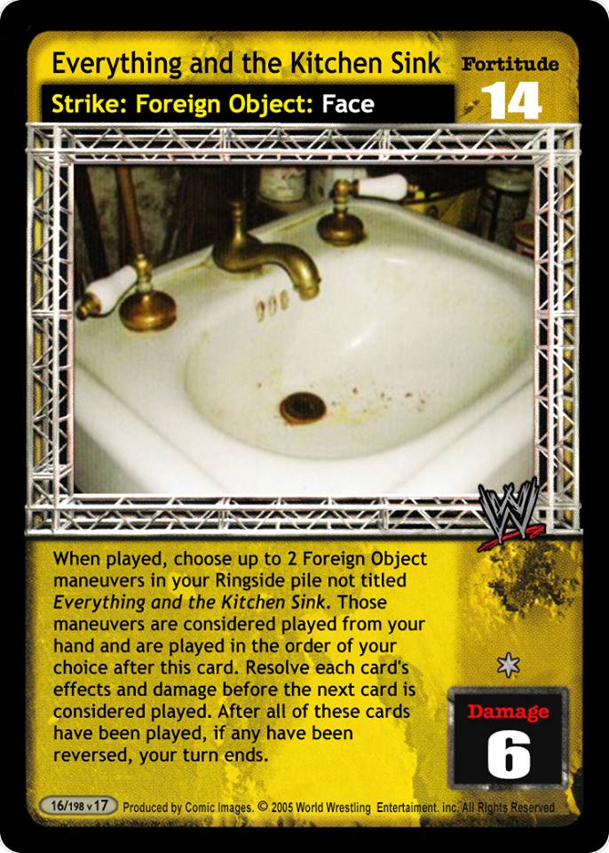 When played, choose up to 2 Foreign Object maneuvers in your Ringside pile not titled Everything and the Kitchen Sink. Those maneuvers are considered played from your hand and are played in the order of your choice after this card. Resolve each card's effects and damage before the next card is considered played. After all of these cards have been played, if any have been reversed, your turn ends.