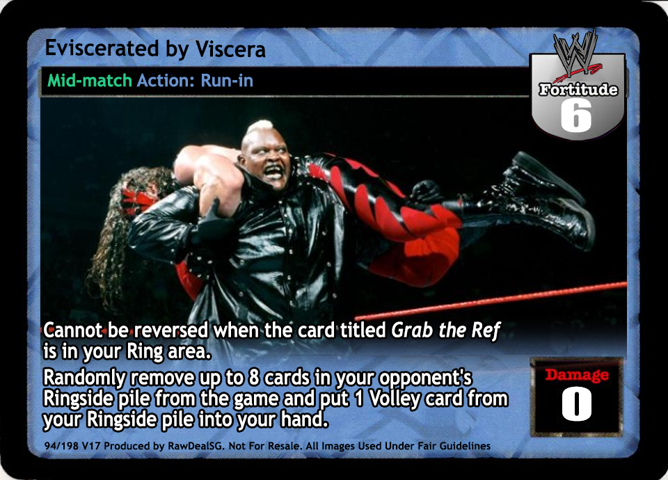 Cannot be reversed when the card titled Grab the Ref is in your Ring area. Randomly remove up to 8 cards in your opponent's Ringside pile from the game and put 1 Volley card from your Ringside pile into your hand.